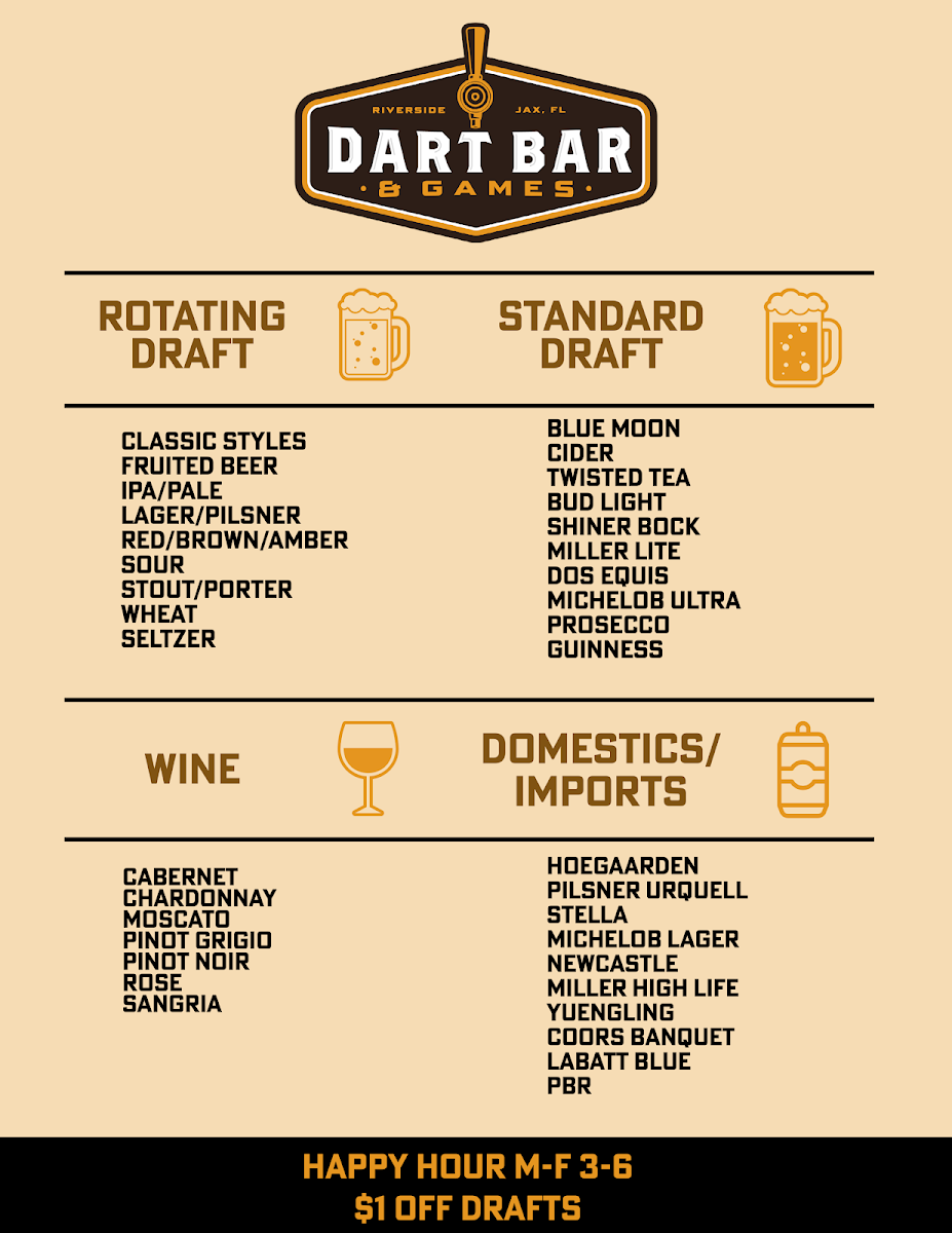 Welcome to Dart Bar & Games, where the fun never stops! Located at 1261 King St in Jacksonville, FL, Dart Bar & Games offers a unique combination of dart arenas and a beer bar that is sure to provide a memorable experience for all who visit.